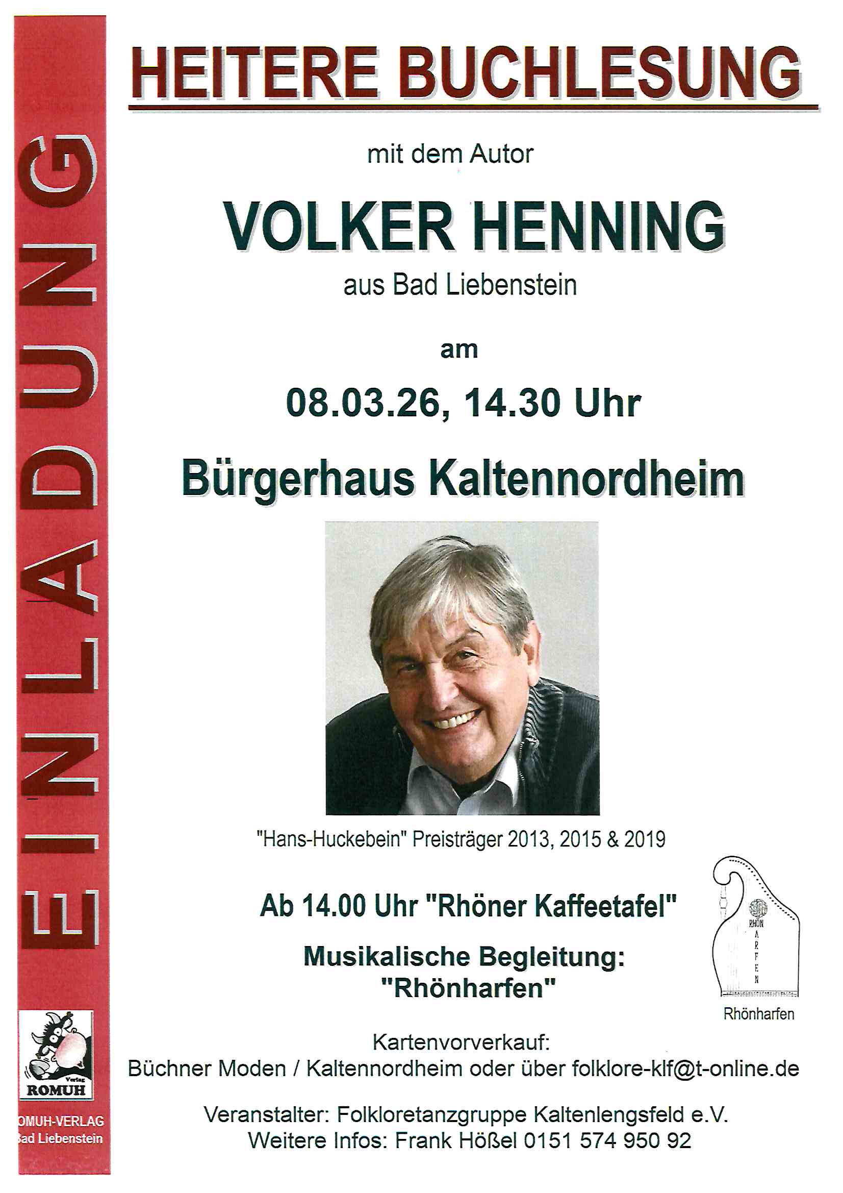 Am 08.03.2026 Rhöner Kaffeetafel mit den „Rhönharfen“ ab 14.00 Uhr sowie ab 14.30 Uhr Buchlesung mit „Volker Henning“ im Bürgerhaus Kaltennordheim SuchenSuchenNeueste BeiträgeÖffentliche Bekanntmachung der zugelassenen Wahlvorschläge für die Wahl des hauptamtlichen Bürgermeisters der Stadt Kaltennordheim am 15.03.2026 Ortsteilratssitzung Kaltensundheim am 05.02.2026 Gemeinderatssitzung Frankenheim am 03.02.2026 Gemeinschaftsversammlung am 05.02.2026 Ergänzungssatzung Am Kies Klings – 2. Offenlegung Neueste KommentareEs sind keine Kommentare vorhanden.