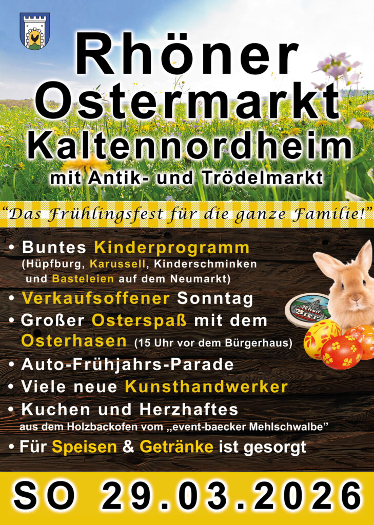 Ostermarkt am 29.03.2026 in Kaltennordheim SuchenSuchenNeueste BeiträgeÖffentliche Bekanntmachung der zugelassenen Wahlvorschläge für die Wahl des hauptamtlichen Bürgermeisters der Stadt Kaltennordheim am 15.03.2026 Ortsteilratssitzung Kaltensundheim am 05.02.2026 Gemeinderatssitzung Frankenheim am 03.02.2026 Gemeinschaftsversammlung am 05.02.2026 Ergänzungssatzung Am Kies Klings – 2. Offenlegung Neueste KommentareEs sind keine Kommentare vorhanden.