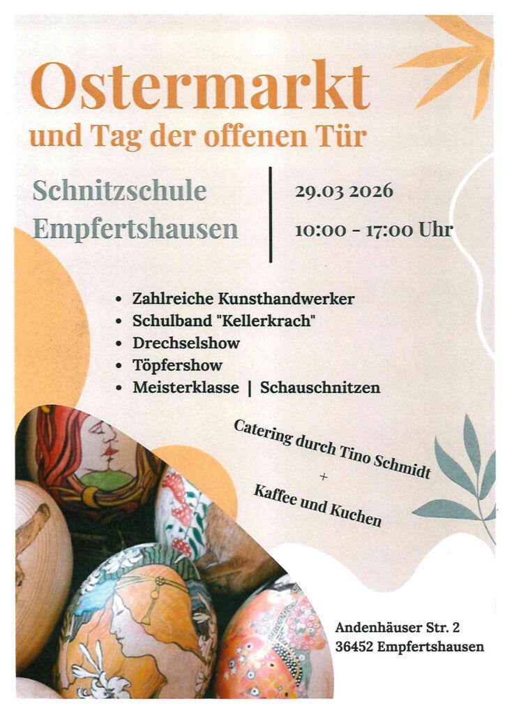 Die Schnitzschule Empfertshausen und der Rhöner Holzbildhauerverein laden alle herzlich zum diesjährigen Ostermarkt mit Tag der offenen Tür ein.