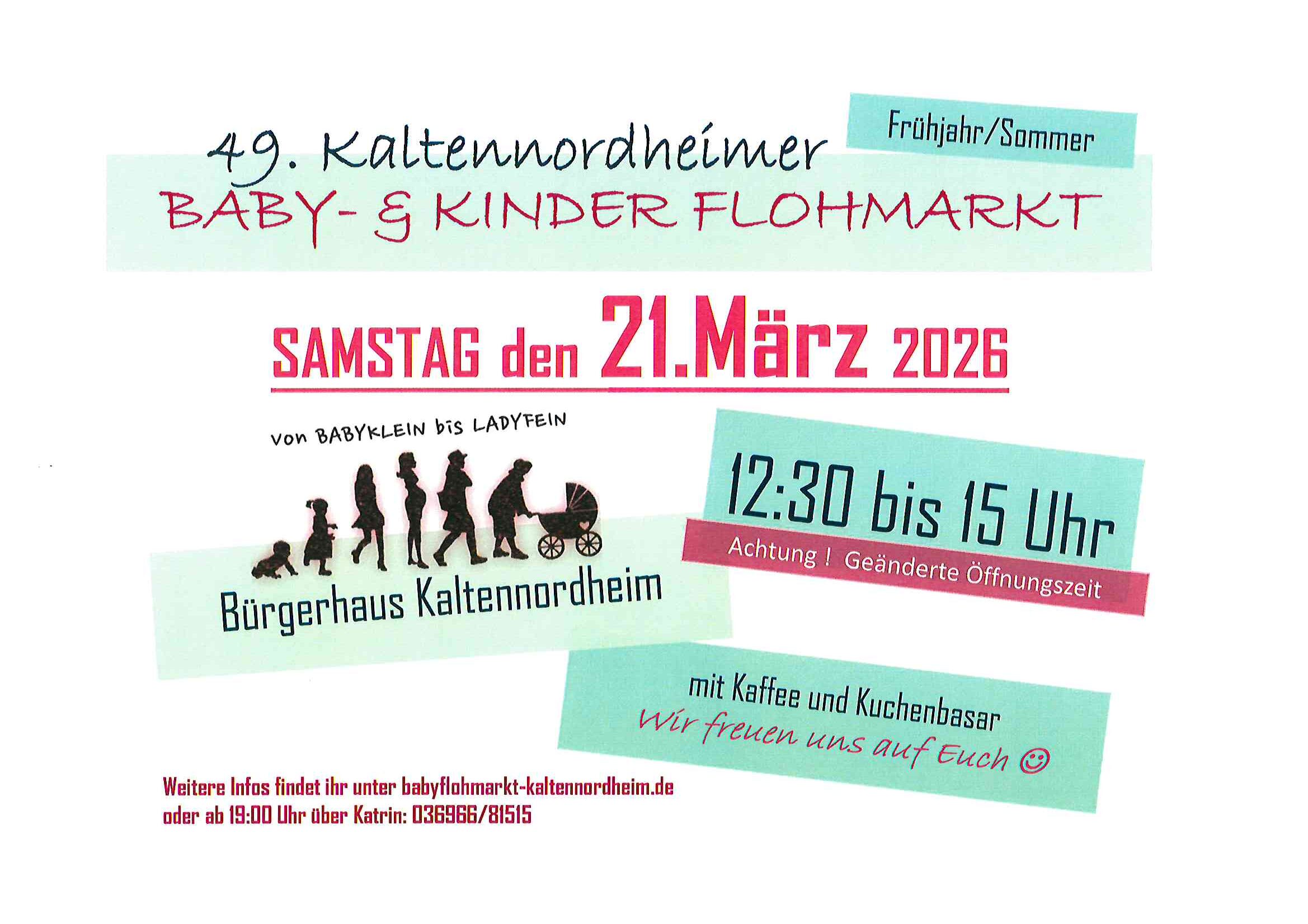 21. März 2026 Ganztags49. Kaltennordheimer Baby- und Kinderflohmarkt am 21.03.2026, von 12.30 Uhr bis 15.00 Uhr, im Bürgerhaus